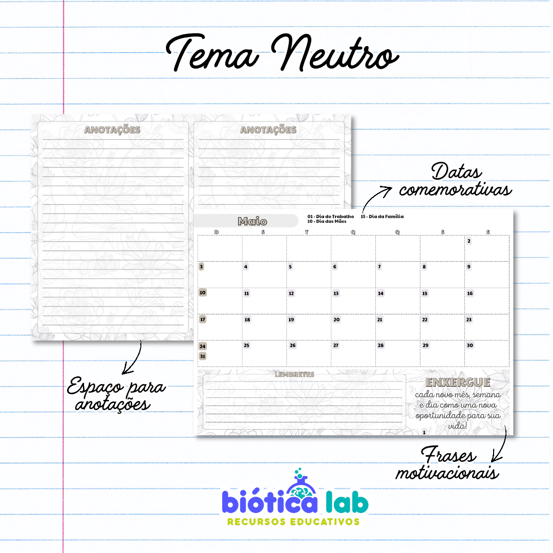 Com foco no planejamento mensal, o material reúne eventos escolares, datas comemorativas pedagógicas e espaço para anotações, facilitando a rotina escolar e o planejamento das atividades.